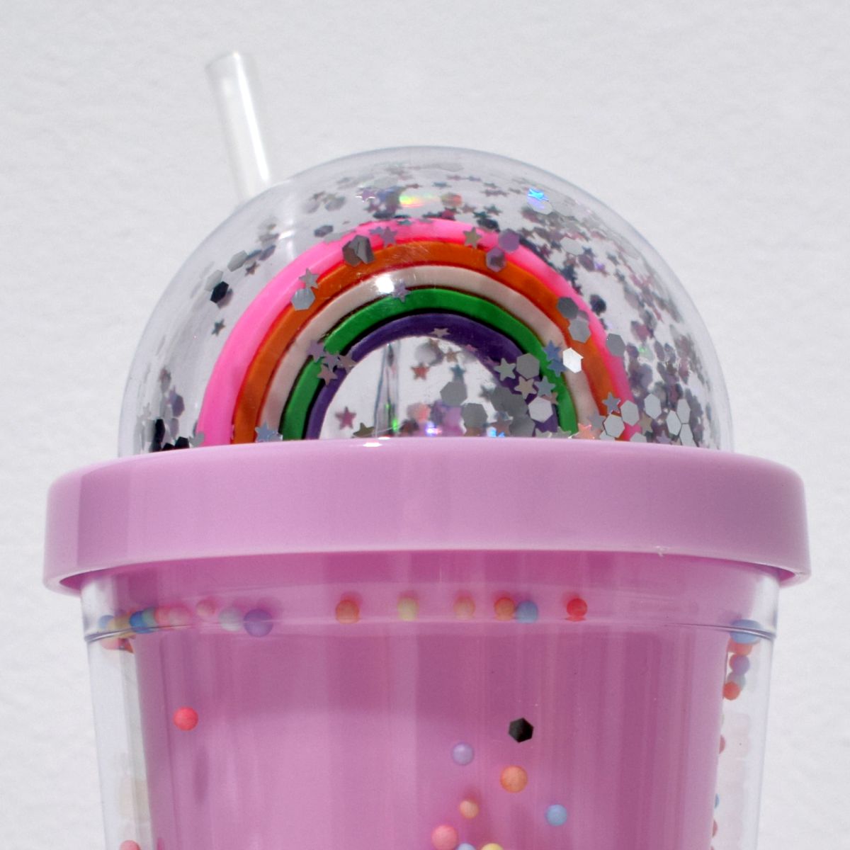 Cu un design captivant, paharul are un capac cu filet si o miniatură cu un curcubeu in interiorul acestuia, care va fascina copiii.