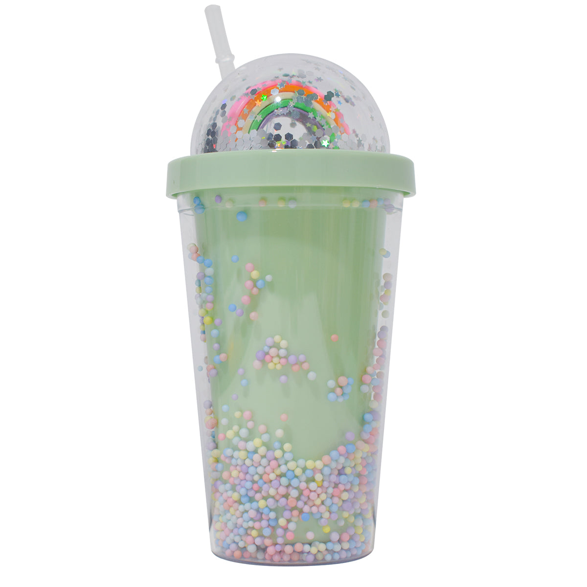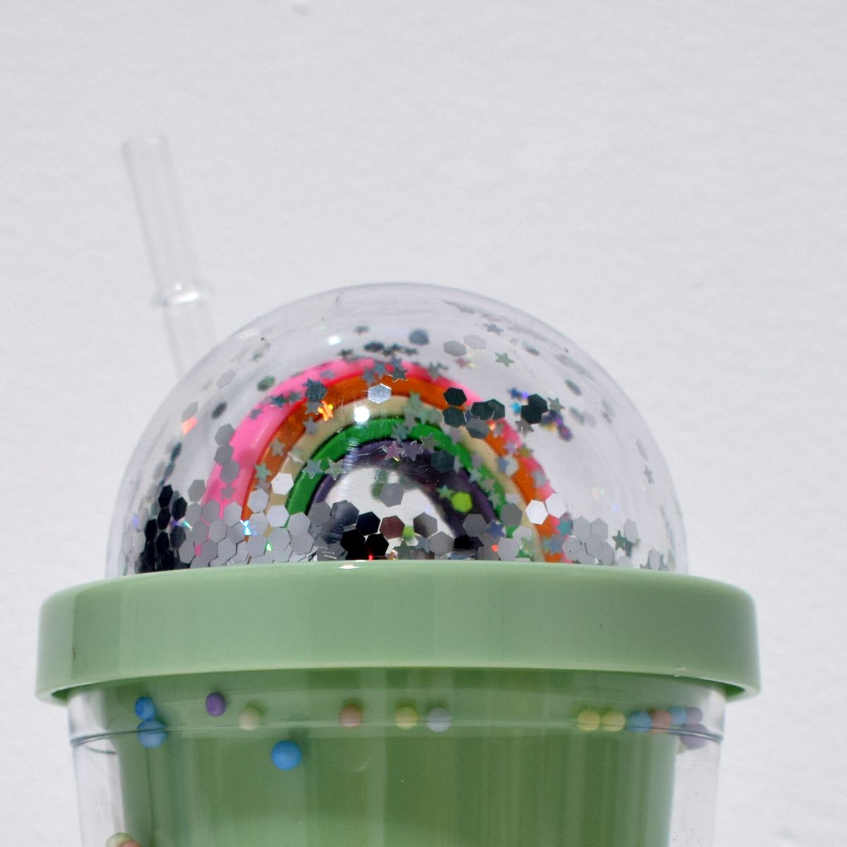 Cu un design captivant, paharul are un capac cu filet si o miniatură cu un curcubeu in interiorul acestuia, care va fascina copiii.