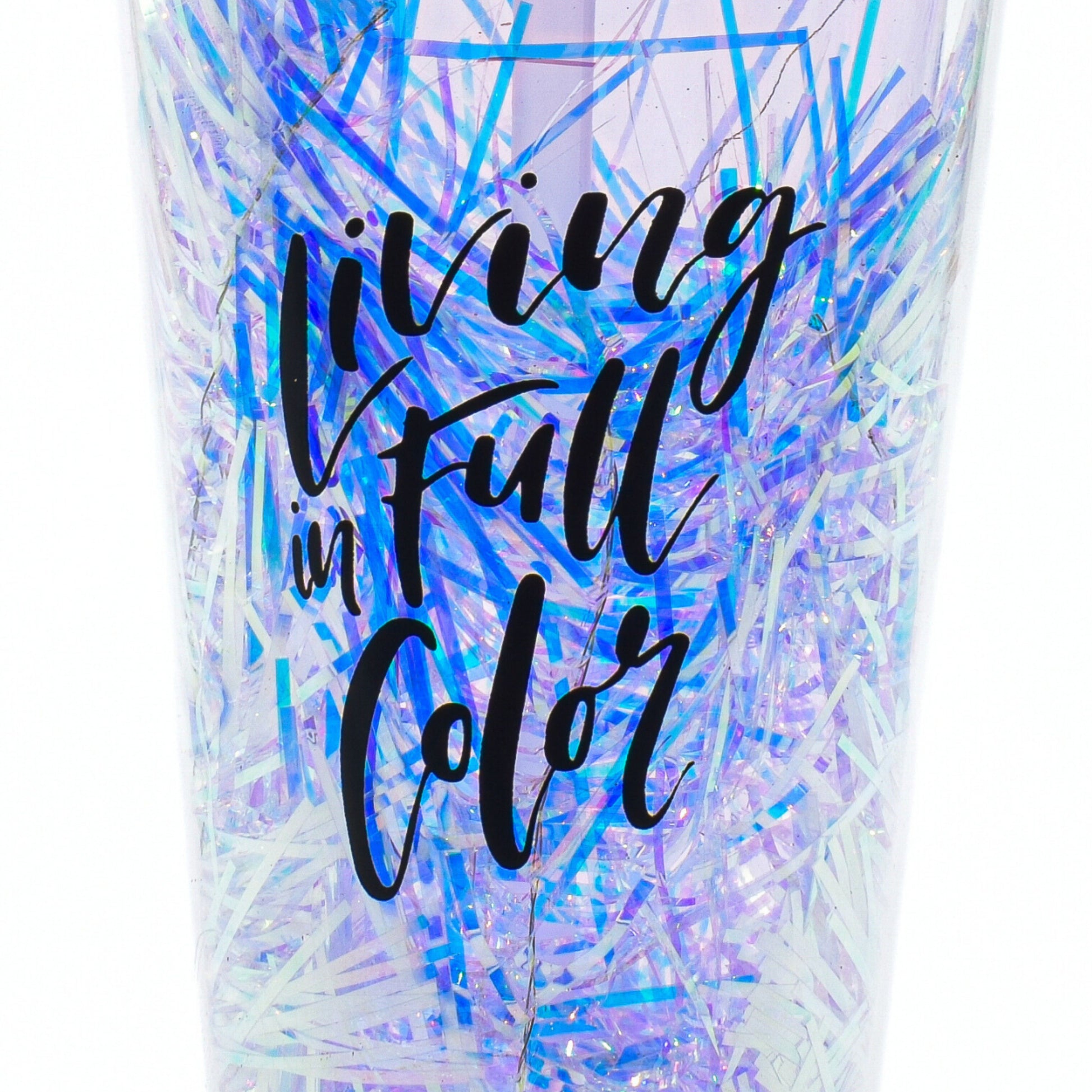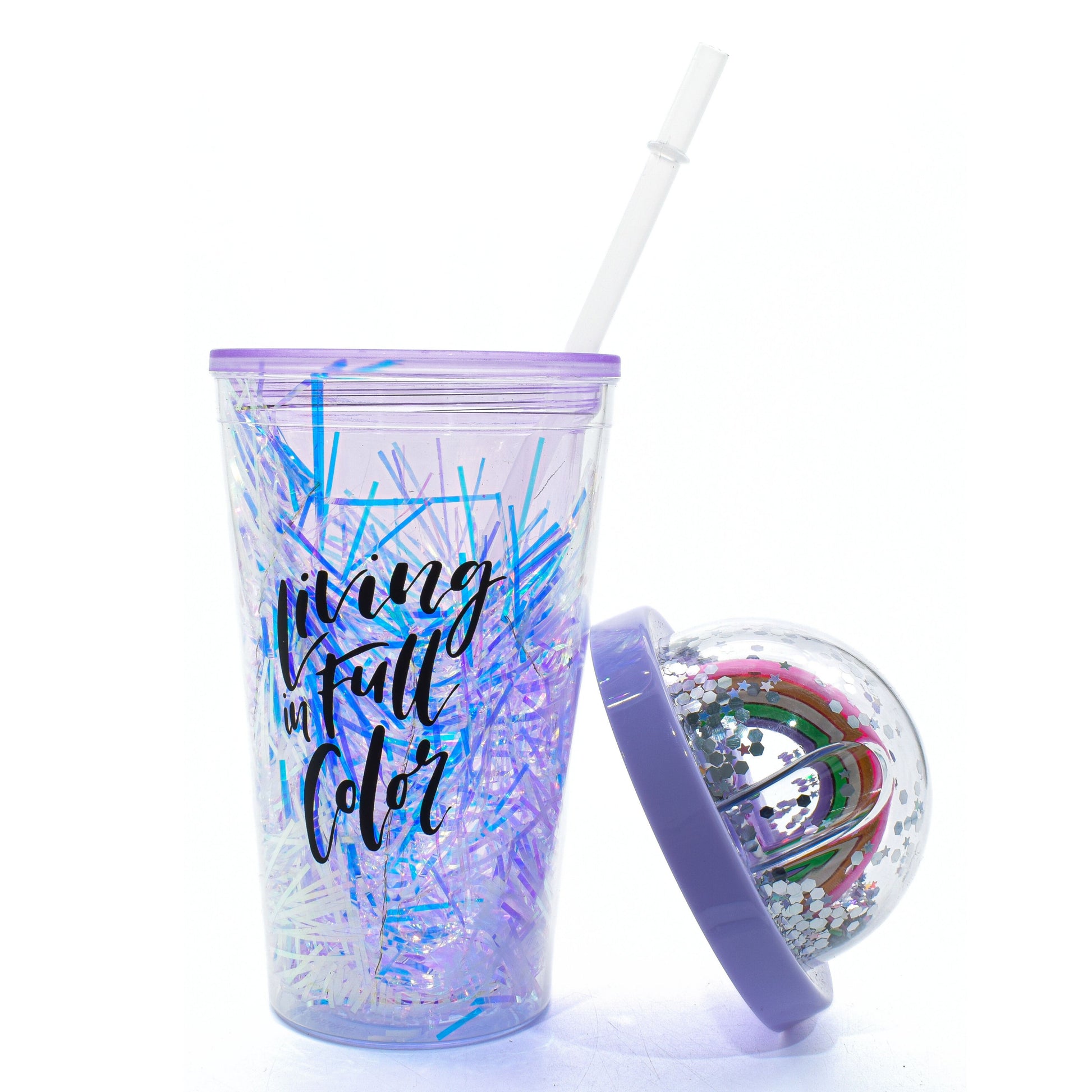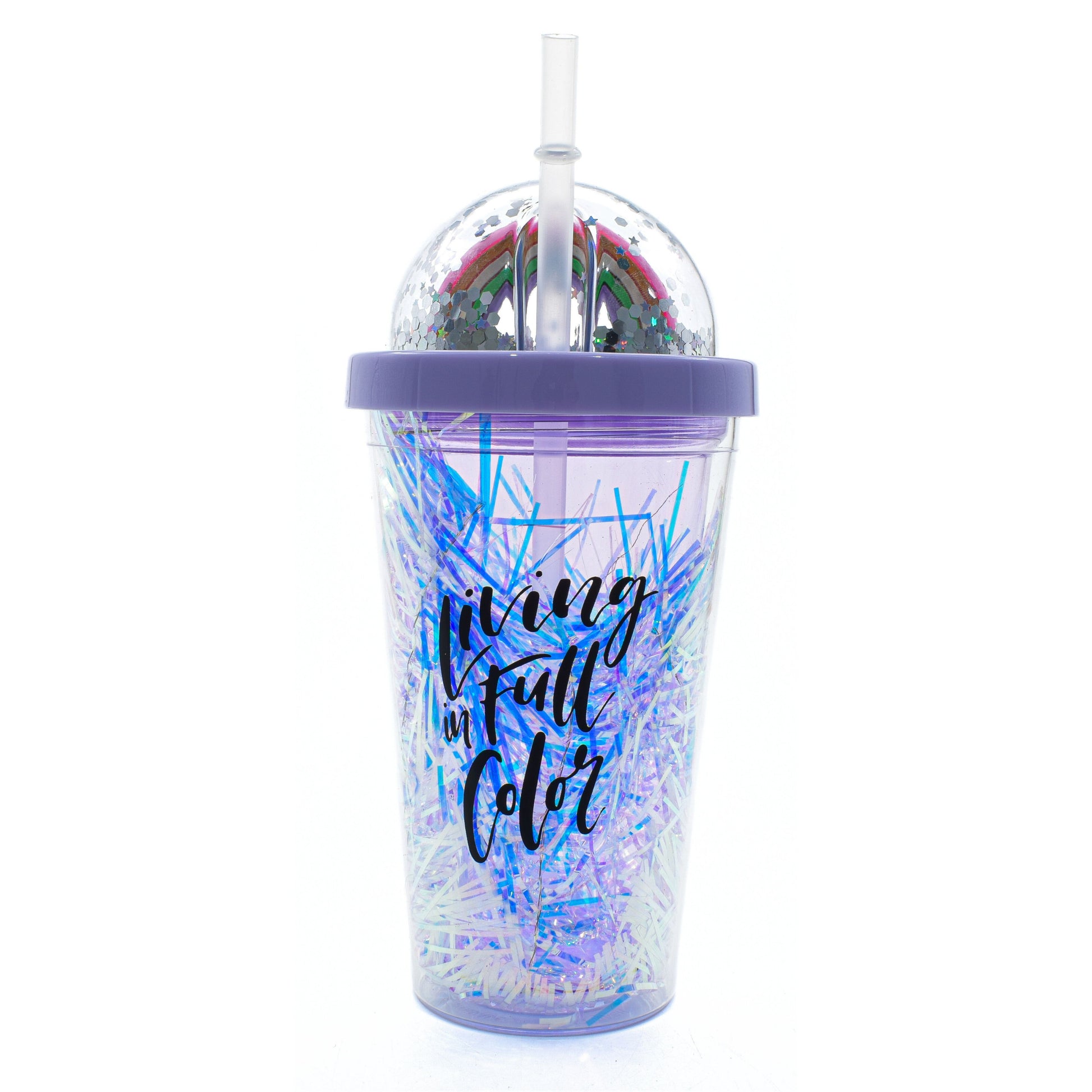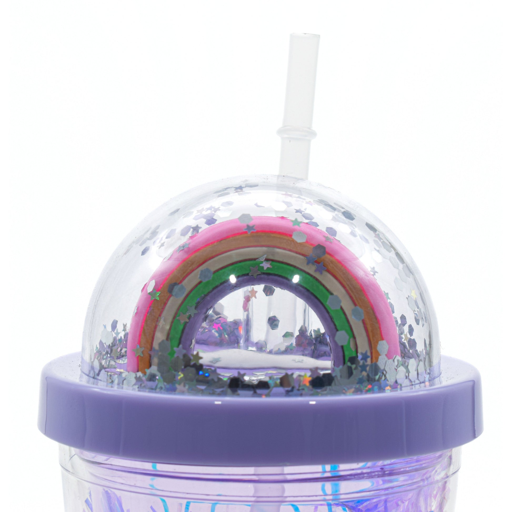 Cu un design captivant, paharul are un capac cu filet si o miniatură cu un curcubeu in interiorul acestuia, care va fascina copiii.