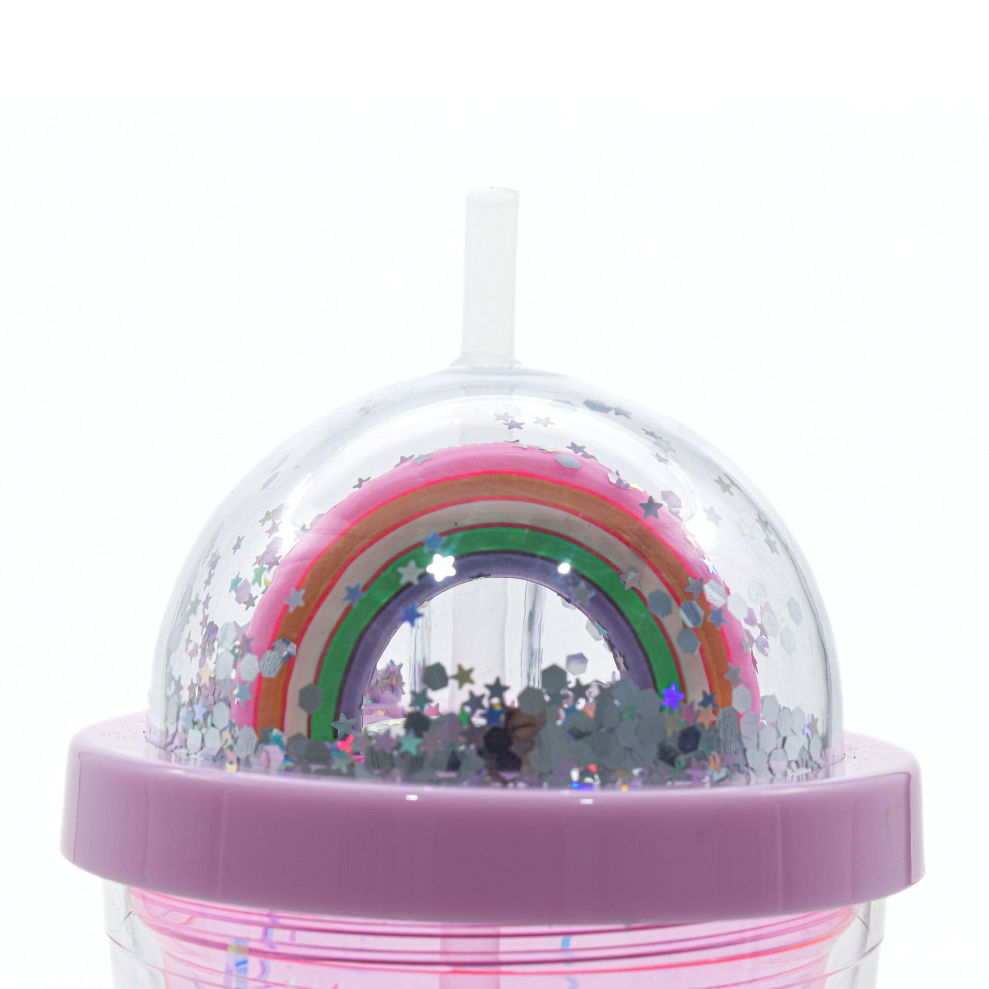 Cu un design captivant, paharul are un capac cu filet si o miniatură cu un curcubeu in interiorul acestuia, care va fascina copiii.