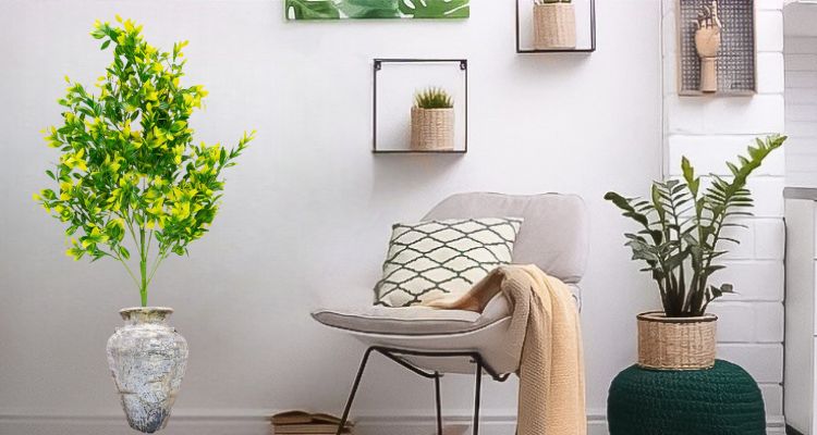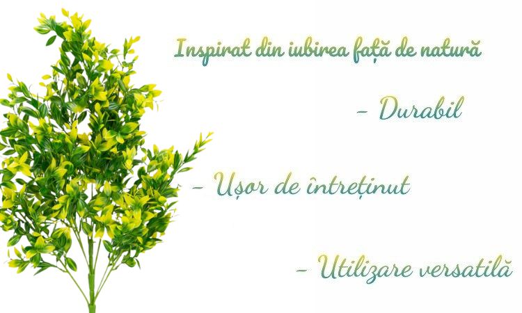 Aceasta planta decorativa artificiala, inspirata de ramura de buxus galben, are frunze dense si floricele delicate, cu un aspect natural si vibrant.