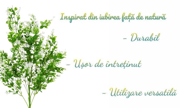 Aceasta planta decorativa artificiala, inspirata de ramurile delicate de buxus cu accente albe, prezinta frunze dense si flori mici,