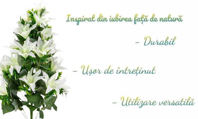 Aceasta planta decorativa artificiala este inspirata de eleganta si frumusetea florilor de Crin, fiind ideala pentru a crea un decor vesel si vibrant.