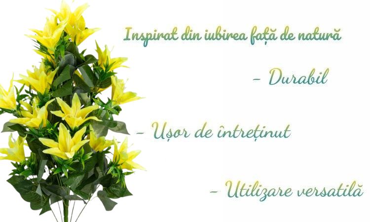 Aceasta planta decorativa artificiala este inspirata de eleganta si frumusetea florilor de Crin, fiind ideala pentru a crea un decor vesel si vibrant.