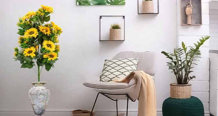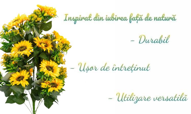 Aceasta planta decorativa artificiala aduce bucuria si caldura florilor de floarea-soarelui, fiind ideala pentru a crea un decor vesel si vibrant.