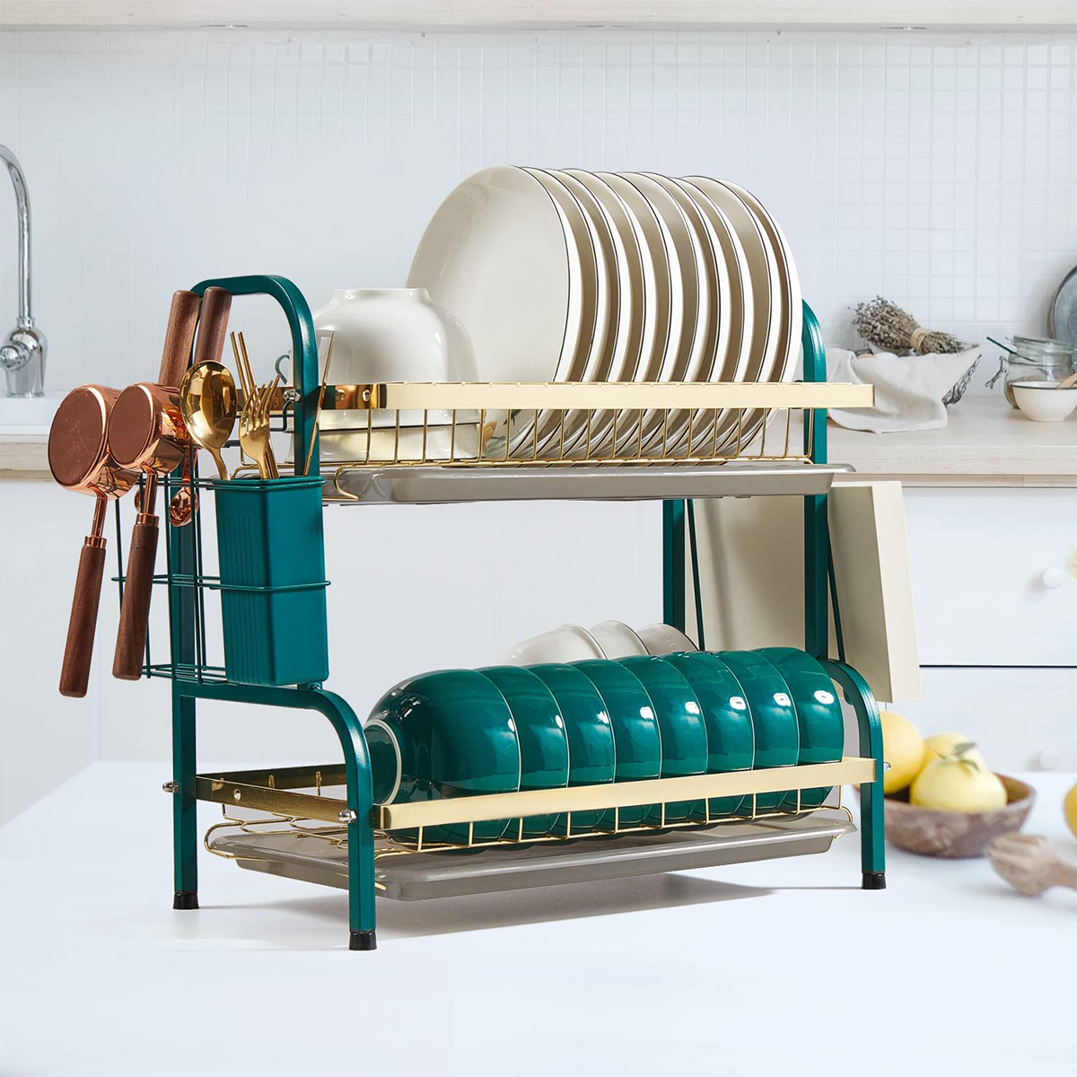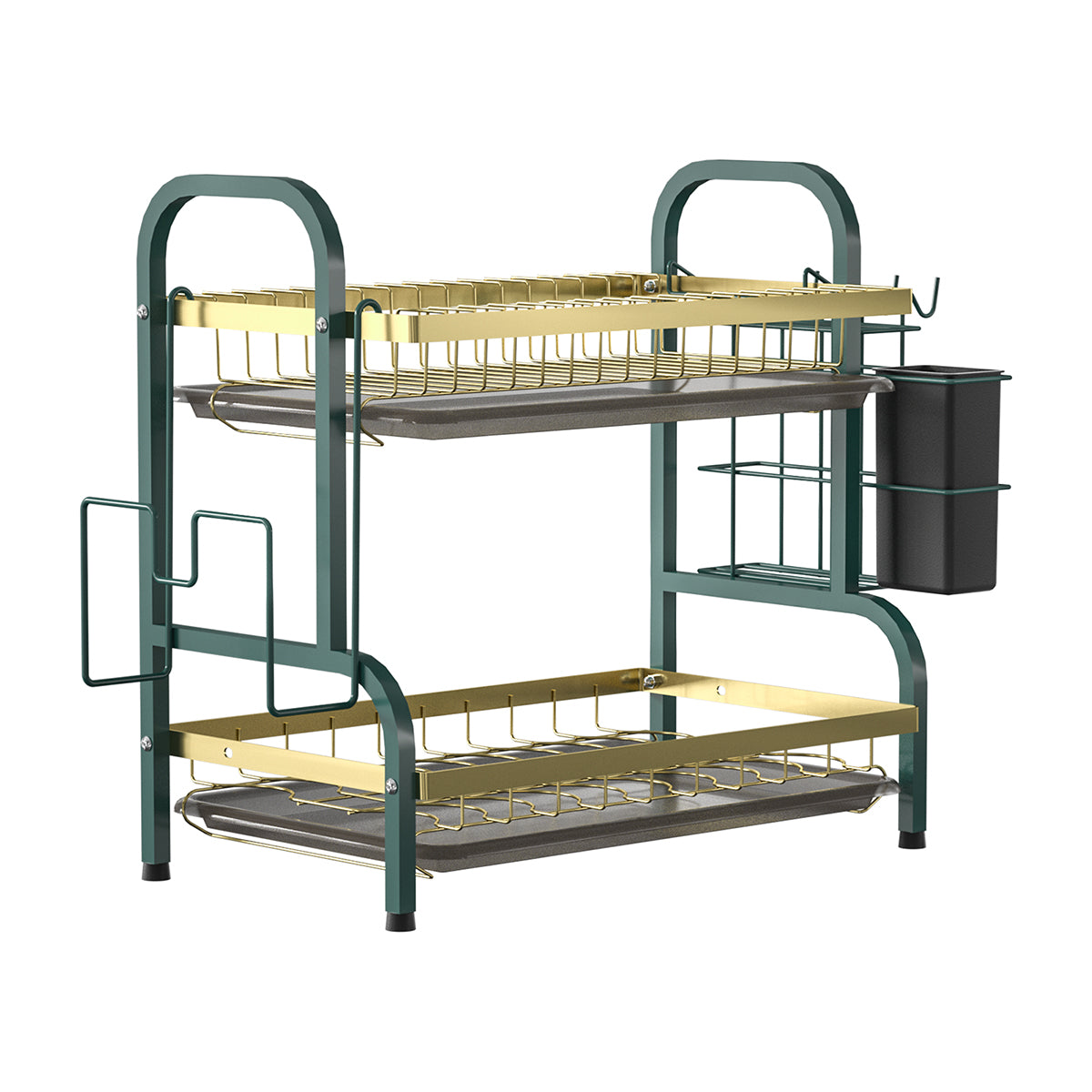 Raft metalic pentru vase si tacamuri, 2 polite, Naimeed D4469, Verde/Auriu