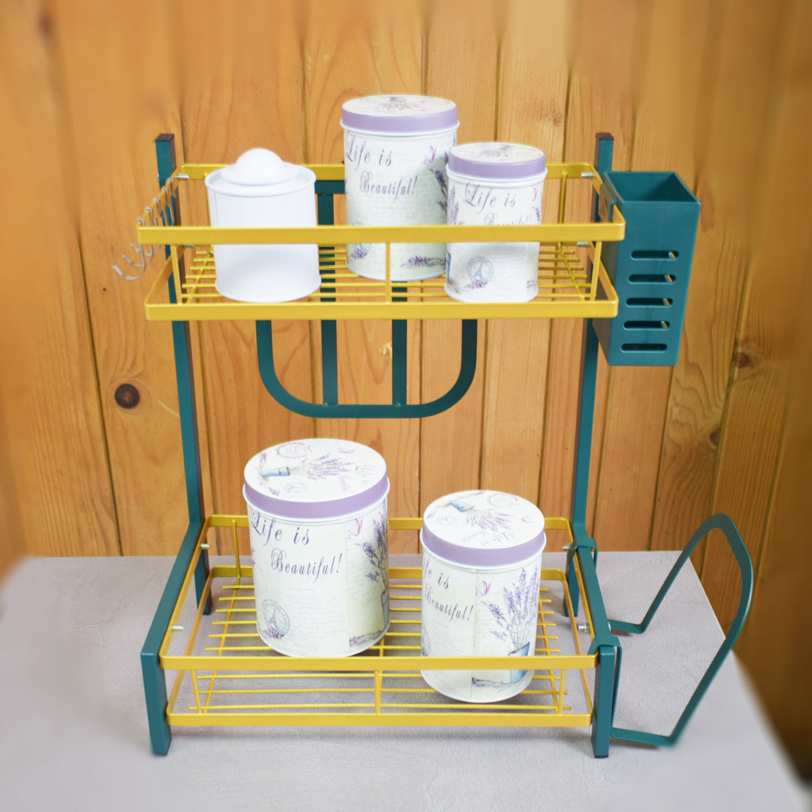 Raft metalic pentru vase si tacamuri, 2 polite, Naimeed D4474, Verde/Auriu