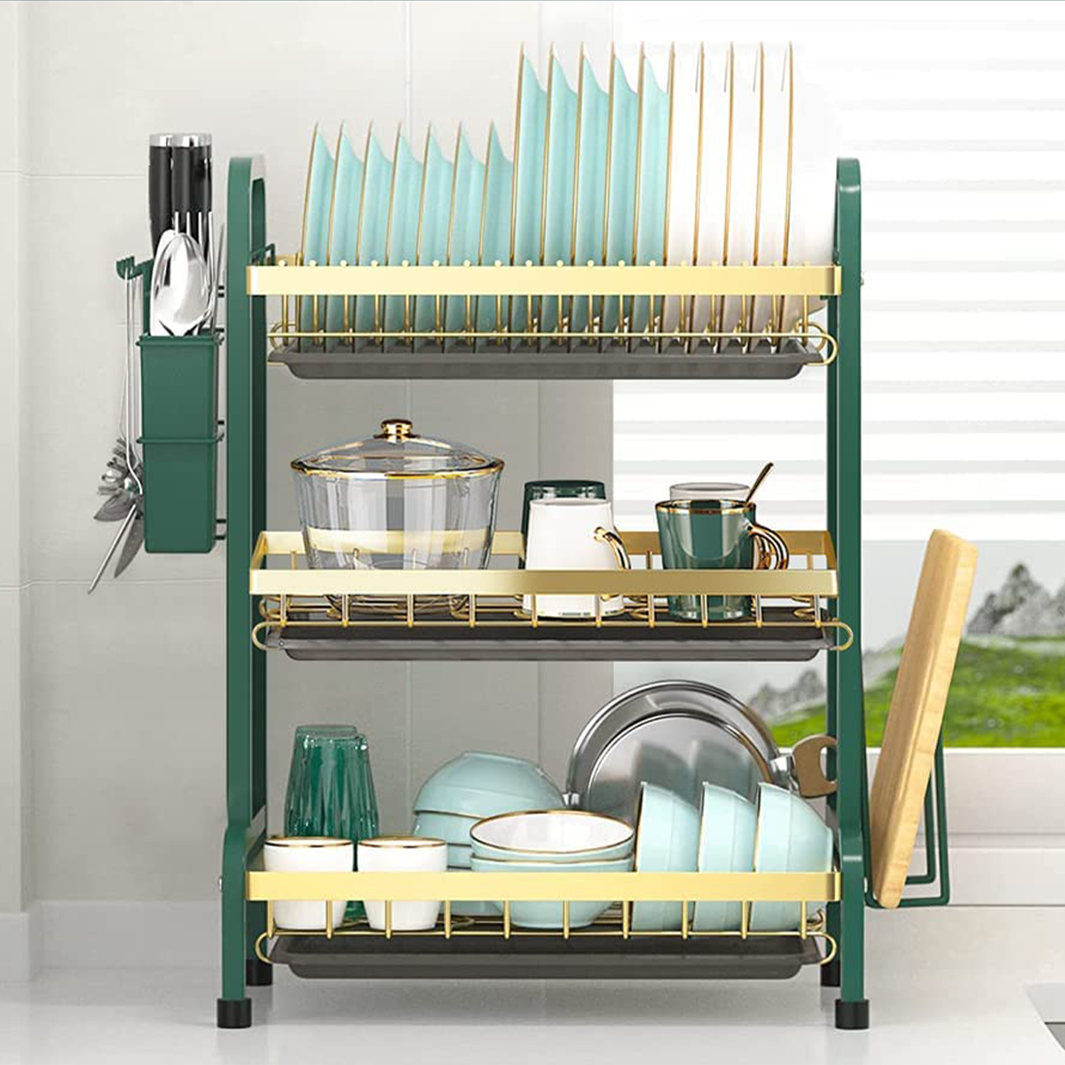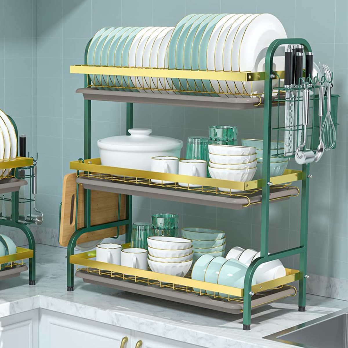 Raft metalic pentru vase si tacamuri, 3 polite, Naimeed D4470, Verde/Auriu