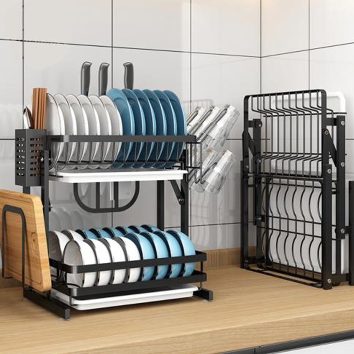 Raft metalic pentru vase si tacamuri, suport pahare, 2 polite, Naimeed D4462, Negru