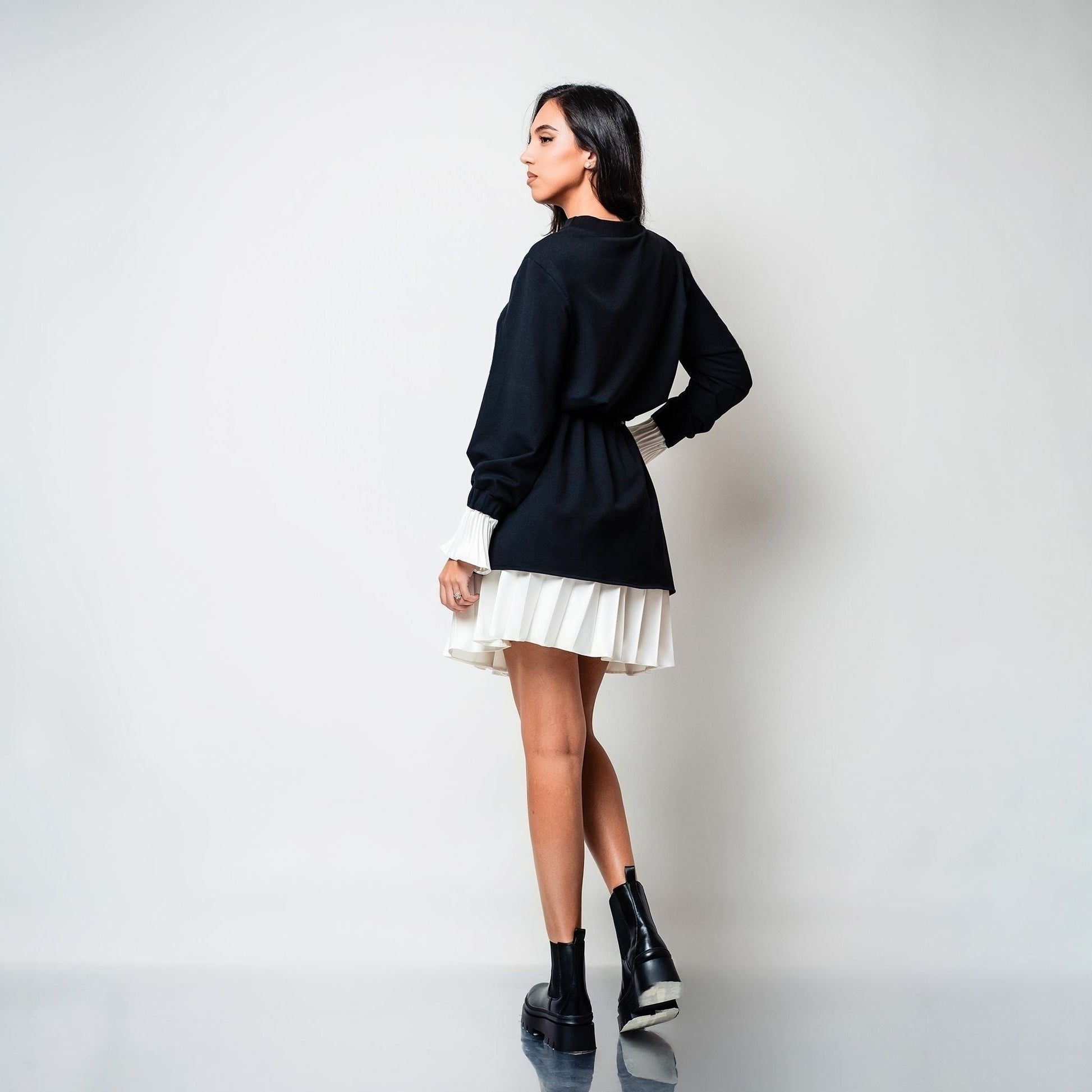 Contrastul surprinzător este creat de fusta albă și manșetele din tafta de mătase plisată, care adaugă un aer rafinat și structurat ținutei. Manșetele conferă o notă de eleganță clasică, completând armonios designul monocromatic.