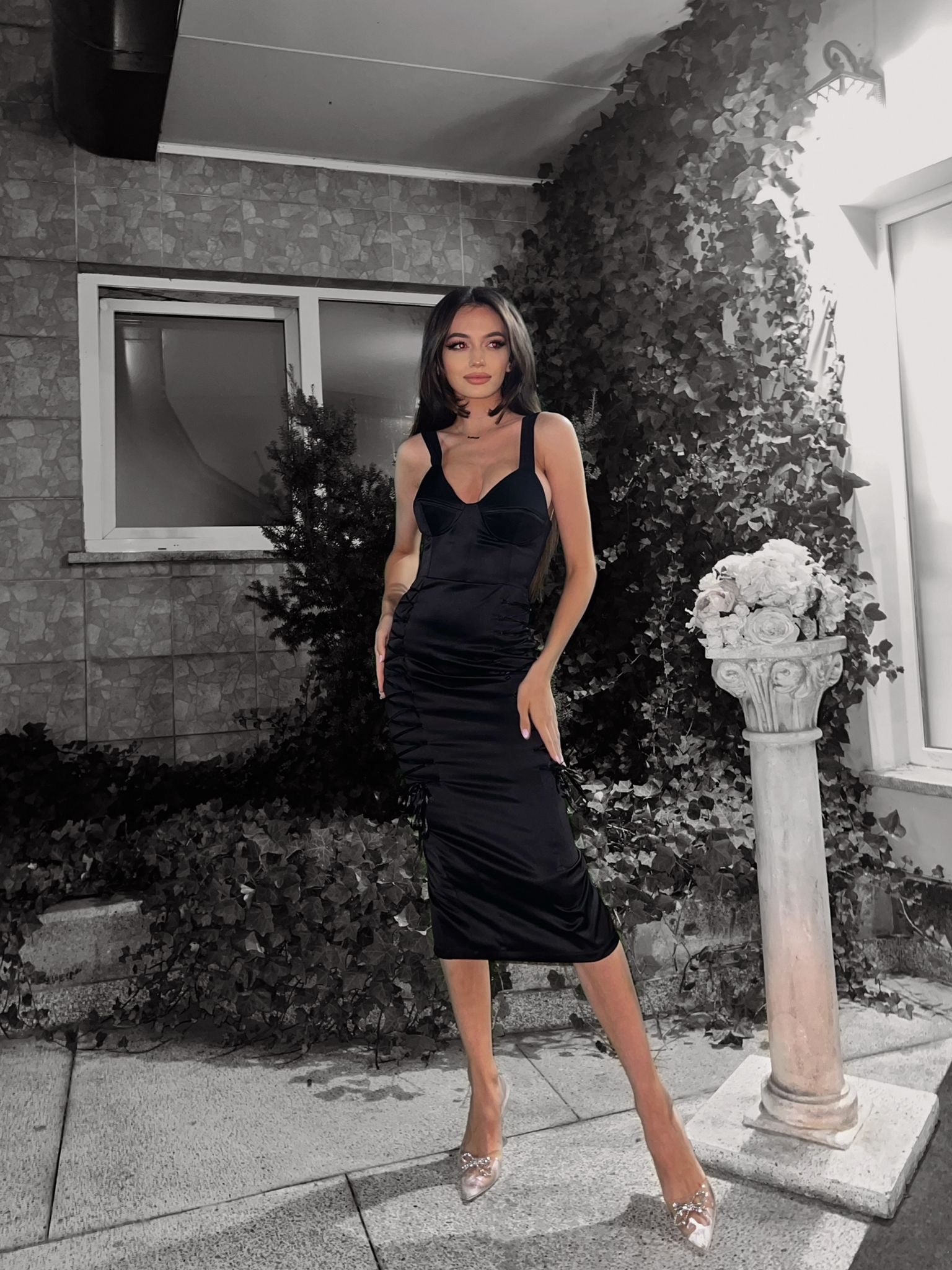 The adjustable side lace-up details add versatility and a personalized touch, while the back slit enhances the dress with added sensuality and freedom of movement.