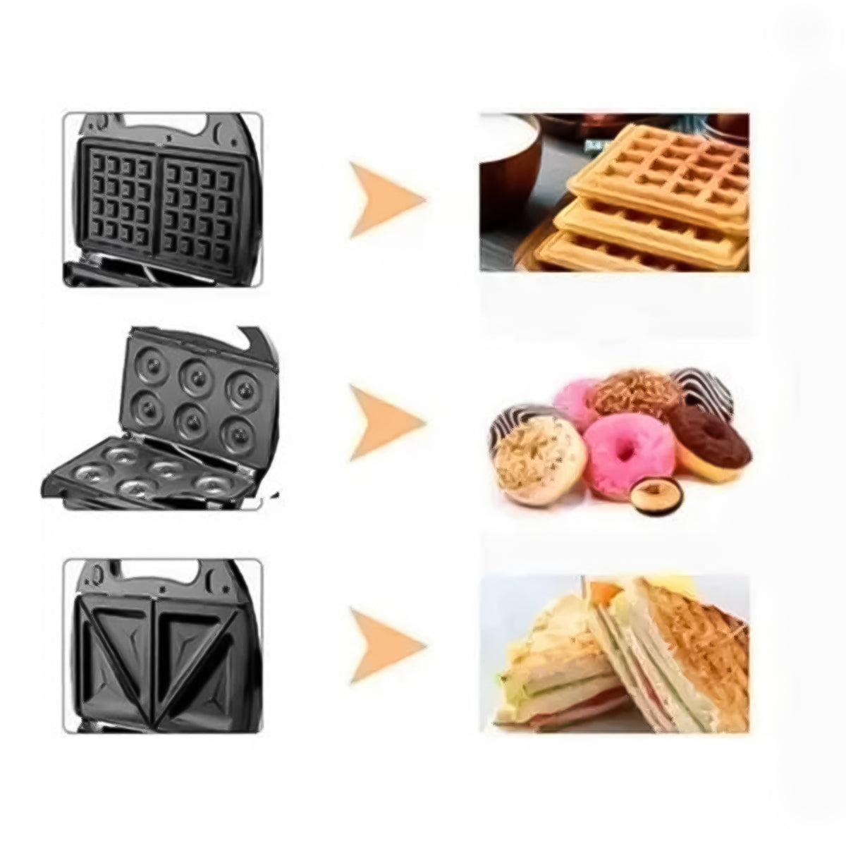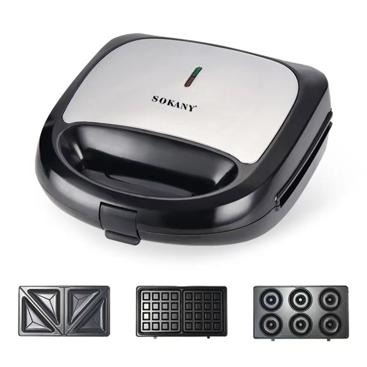 Sandwich maker 3 in 1 Sokany SK-902, 750 W, 3 placi detasabile anti-aderente, Negru/Inox