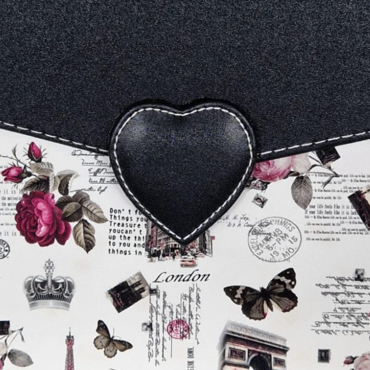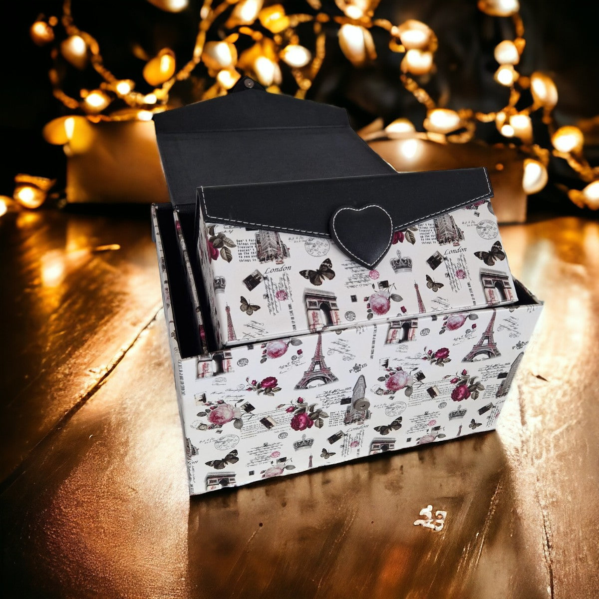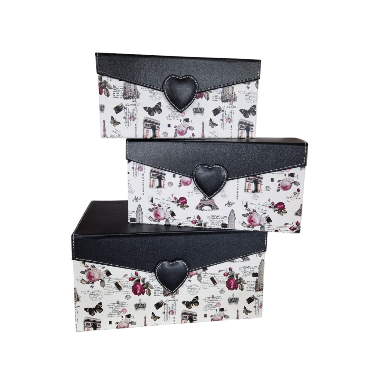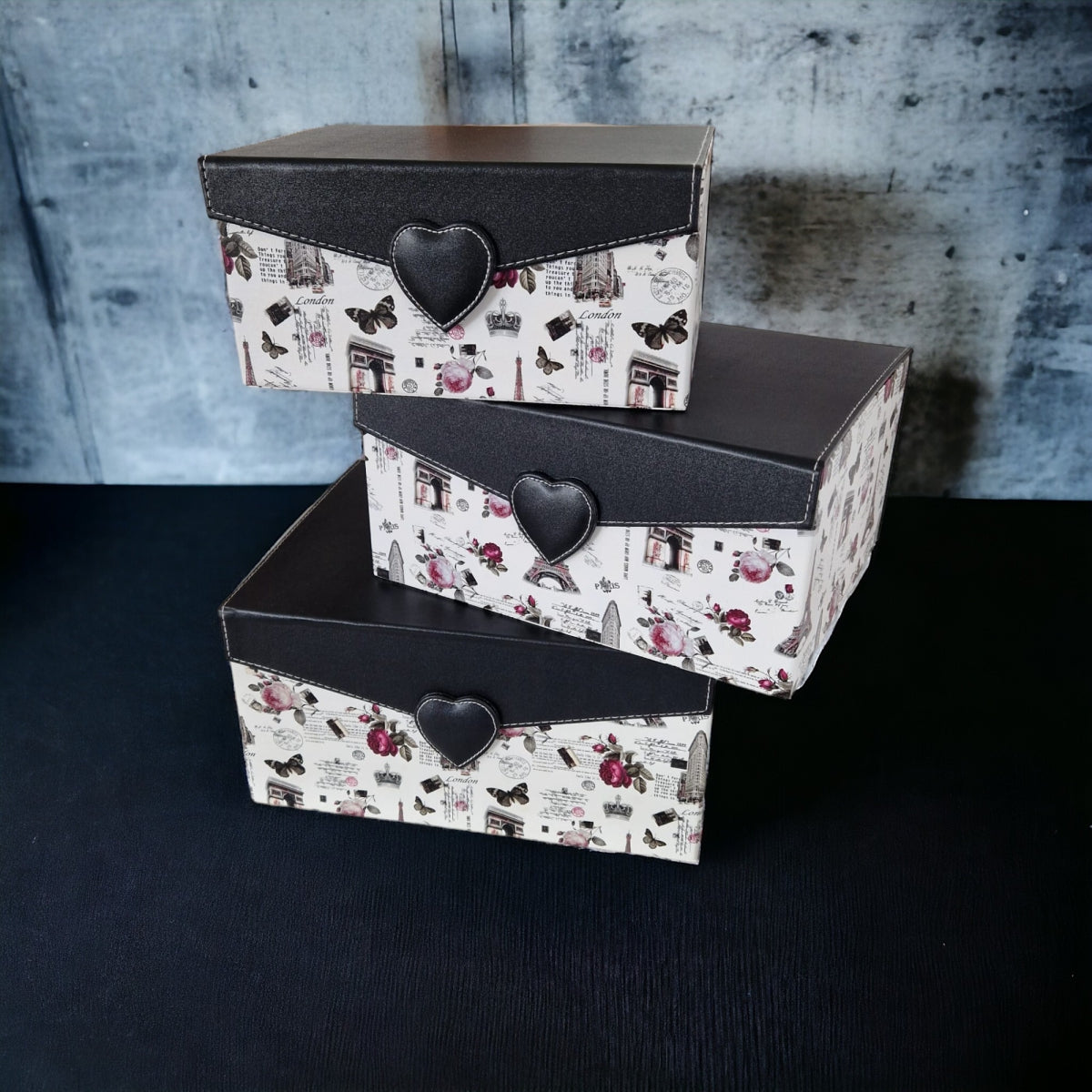 Set 3 cutii depozitare, model Autour du monde, capac inimioara, Negru-Alb