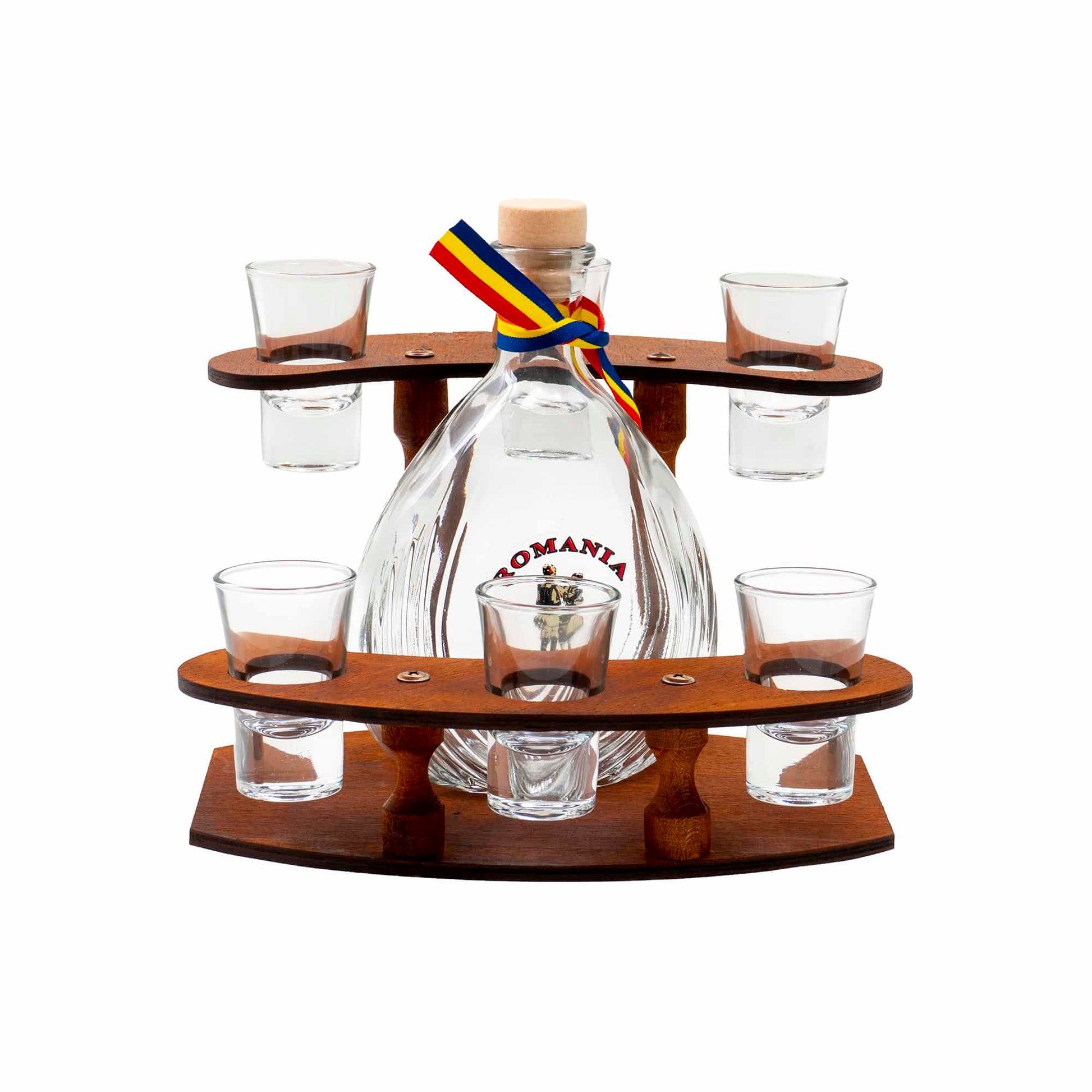 Set din lemn cu sticla si 6 pahare, un cadou inedit si un decor traditional autentic.