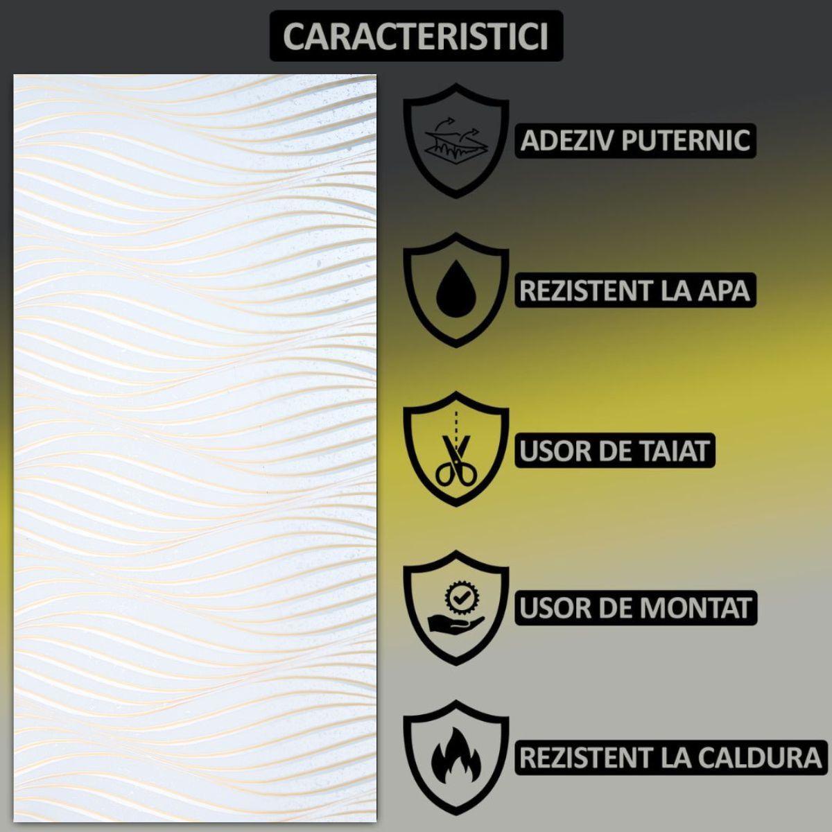 Autoadeziv – instalare rapida si usoara fara a fi nevoie de adeziv suplimentar sau unelte speciale.