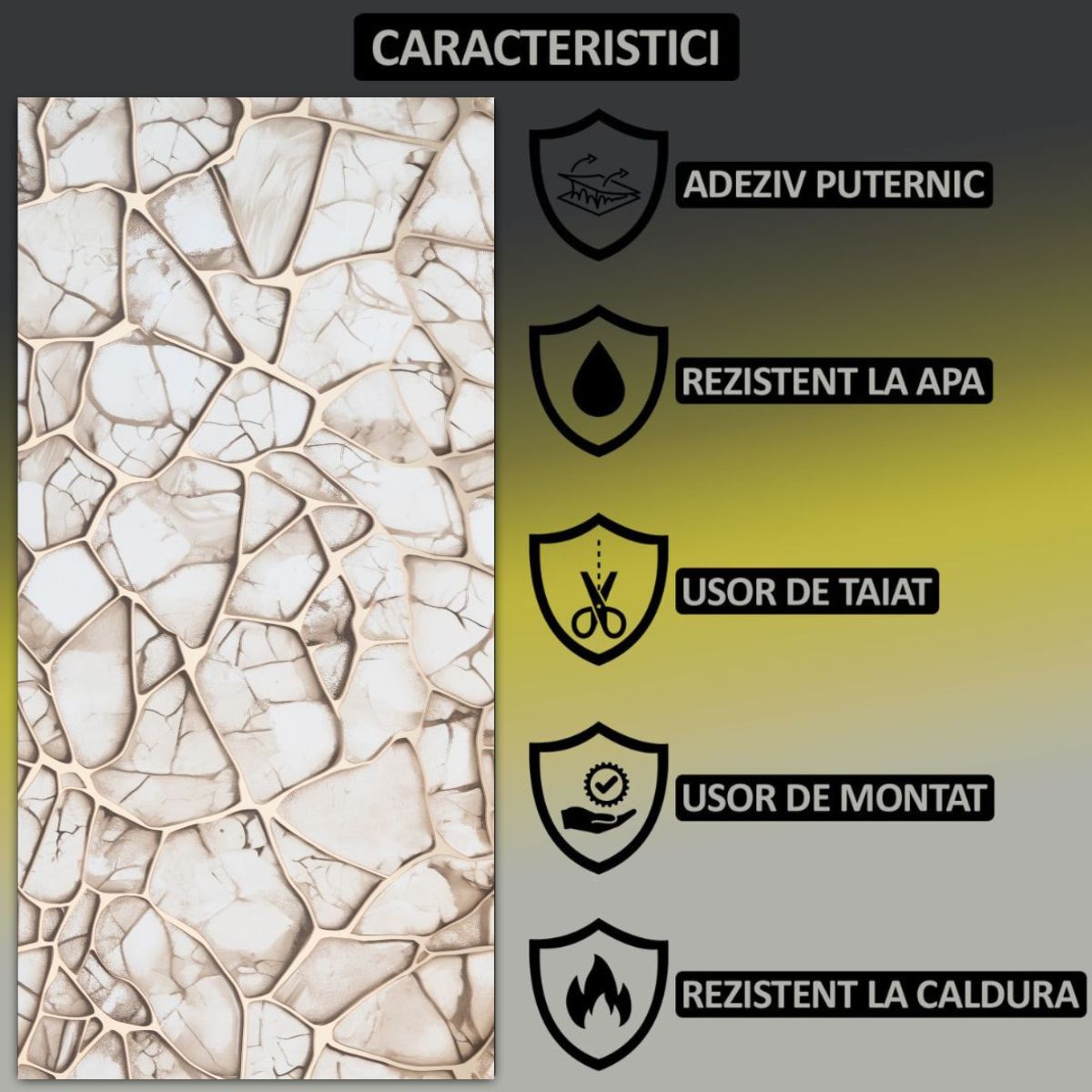 Panourile sunt fabricate din spuma EVA cu strat de aluminiu pentru durabilitate sporita si un finisaj lucios tip marmura.