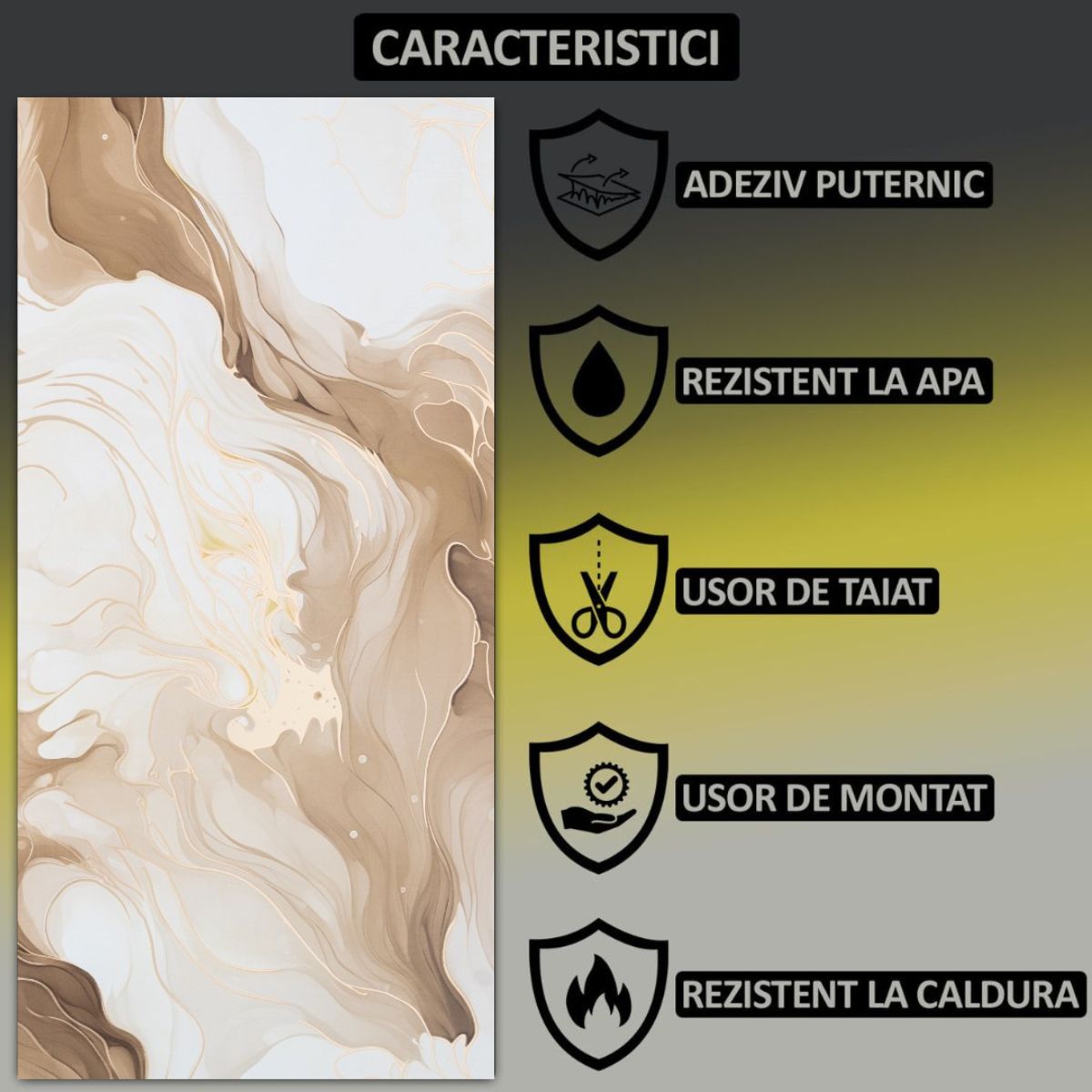 Panourile sunt fabricate din spuma EVA cu strat de aluminiu pentru durabilitate sporita si un finisaj lucios tip marmura.