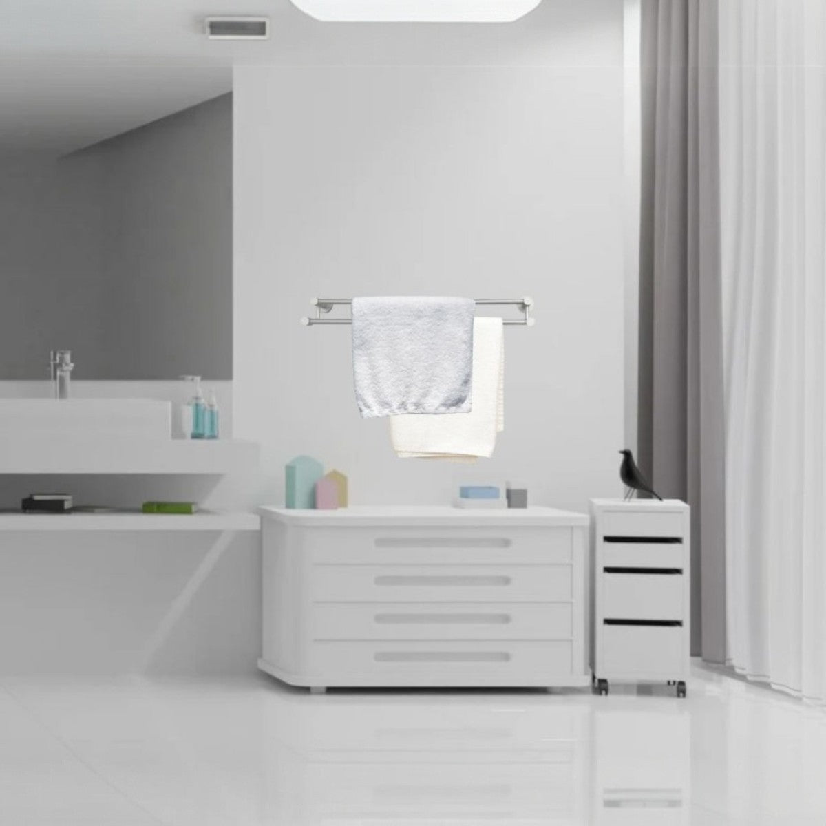 Designul cu doua bare permite organizarea eficienta a prosoapelor, iar montajul pe perete economiseste spatiu.
