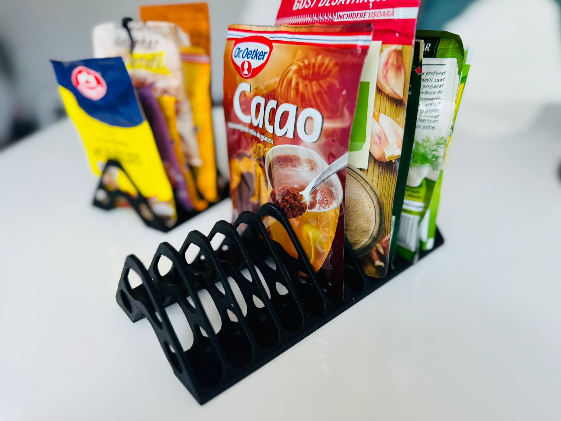 Pastreaza ordinea in bucatarie si gaseste rapid condimentele preferate cu ajutorul acestui suport compact si eficient, special creat pentru plicurile de condimente de tip ziplock sau cu ambalaj standard. Produs local, prin tehnologie de printare 3D, din material PLA ecologic.Caracteristici: 12/5 compartimente individuale pentru organizarea plicurilor de condimente Dimensiuni compacte – ideal pentru sertare, rafturi sau blat de bucatarie Compatibil cu majoritatea plicurilor standard (Dr. Oetker, Kamis, Fuchs etc. Realizat din PLA biodegradabil – durabil, usor si prietenos cu mediul Culoare: negru mat, design minimalist