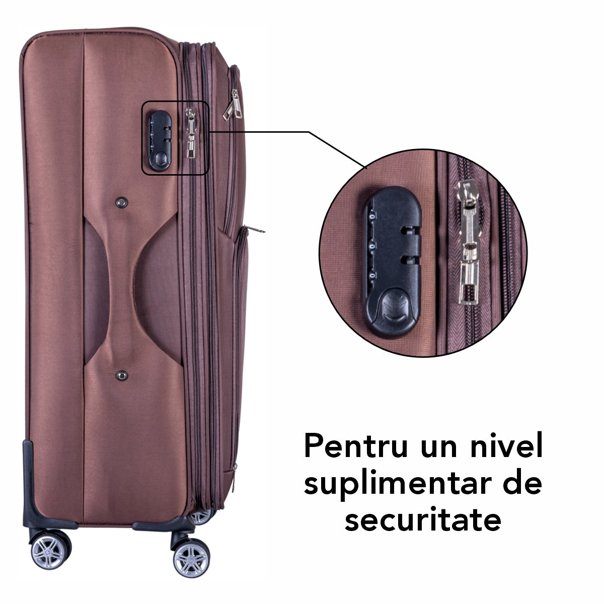 Troler voiaj Mediu, Naimeed D6000, 4 roti duble 360 grade, material textil, inchidere cifru, Maro, 41x23x68cm